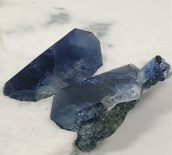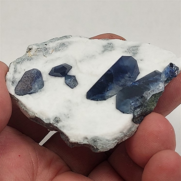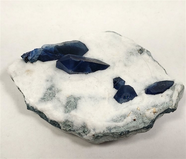 The sharply terminated benitoite crystals, have that beautiful blue coloring,