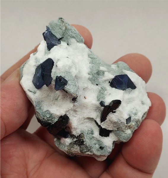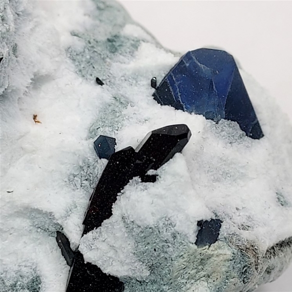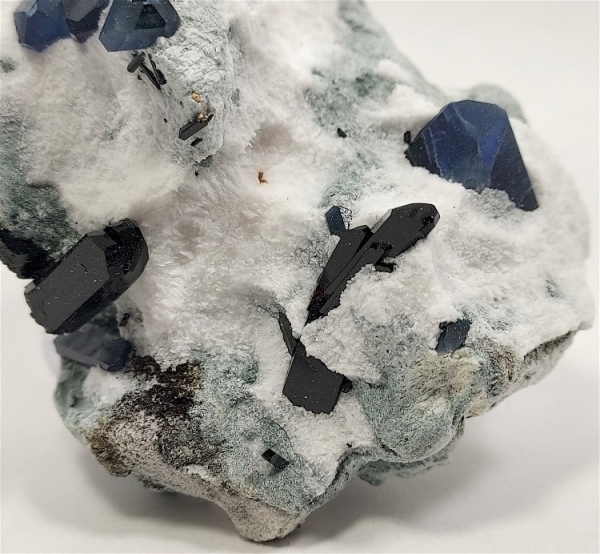 Here is a beautiful specimen of crystals on a bluish-green schist matrix with snowy white natrolite.