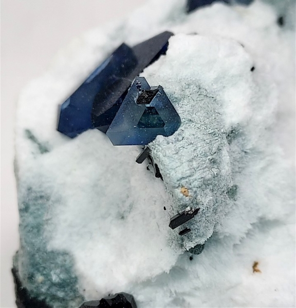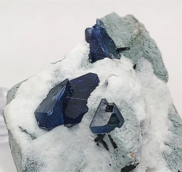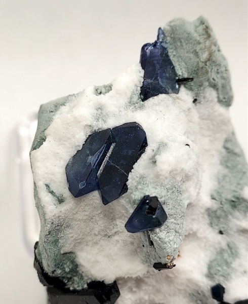 It has beautiful, gemmy, deep blue benitoite crystals up to 1.4 cm, partially exposed from the natrolite.