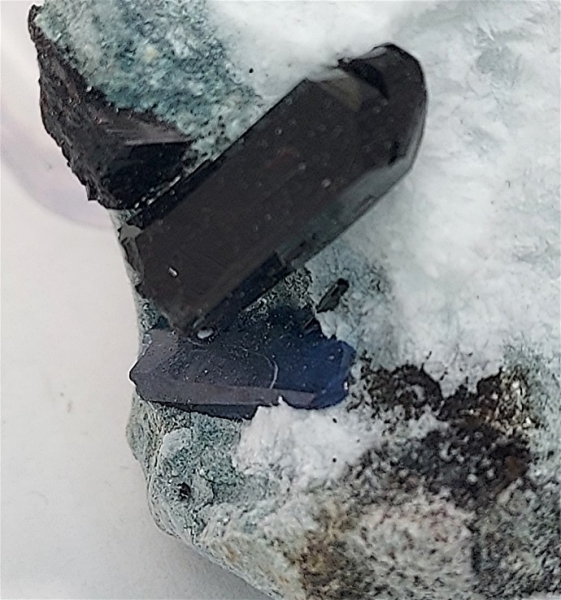 One smaller crystal had its growth interrupted by a neptunite that it formed around.
