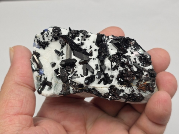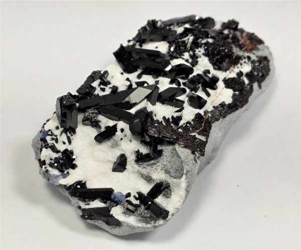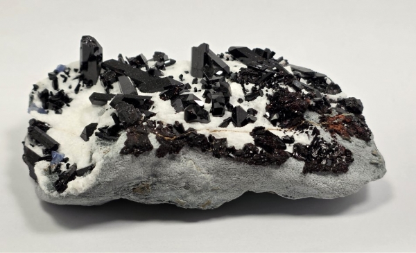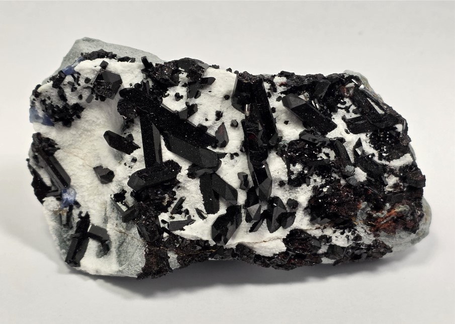 The deep black crystals really stand out against a blanket of snowy white Natrolite atop of a greenish blue schist.