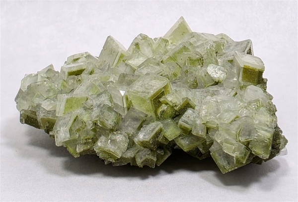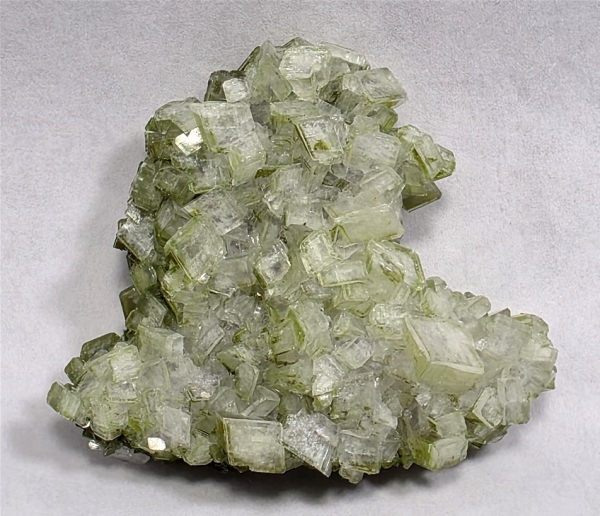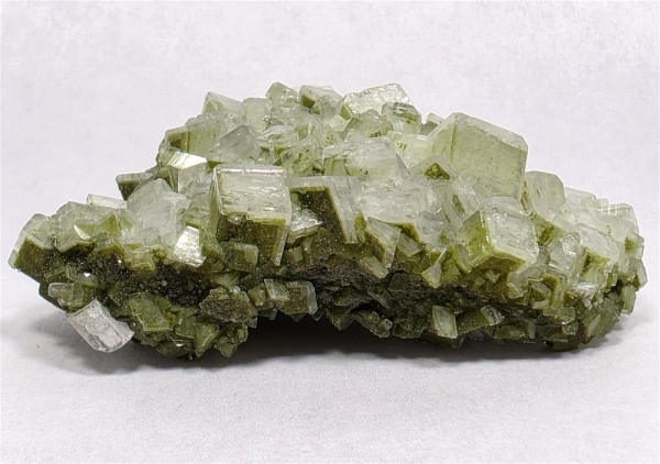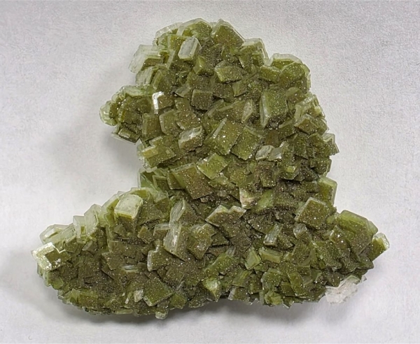 One one side of the specimen, the calcite crystals are covered in olive green micro crystals of Mottramite.